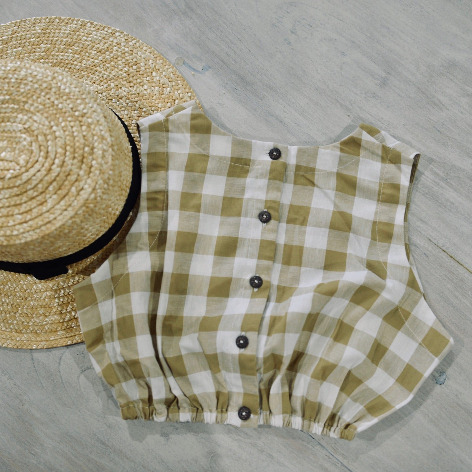 The Maggie top is made from 100% soft cotton in beige check and features recycled coconut shells for buttons.